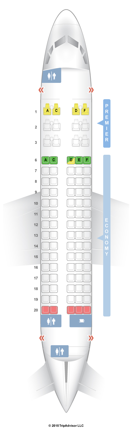 This Sukhoi Superjet features 87 seats in a 2-class configuration. Business Class is rows 1-3 and Economy Class is rows 6-20. There are Space+ seats in row 6 that offer additional legroom in Economy Class. Space+ seats may be selected for an additional fee at check-in.