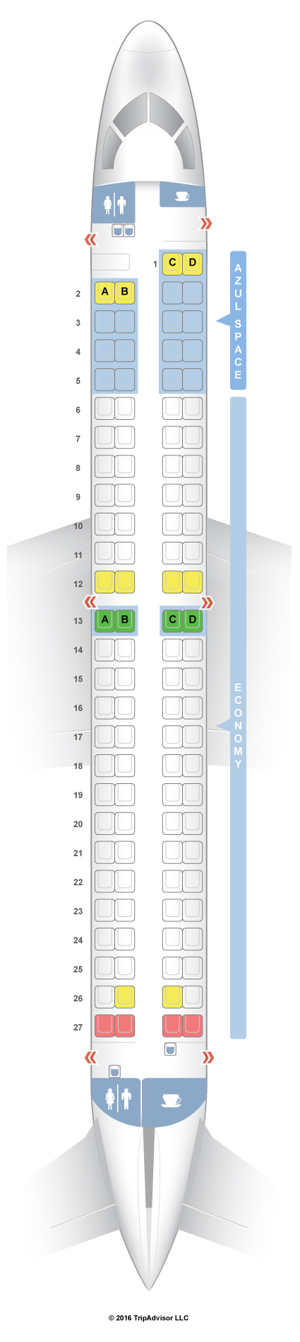 Azul's E-190 offers two by two leather seating and individual inflight entertainment monitors at every seat. Azul was the first airline in Latin America to feature inflight entertainment monitors at every seat on all of its jets. Seating on Azul's E-190 includes 84 regular economy and 22 Azul Space seats providing an additional 3 in/8 cm legroom for an added fee.