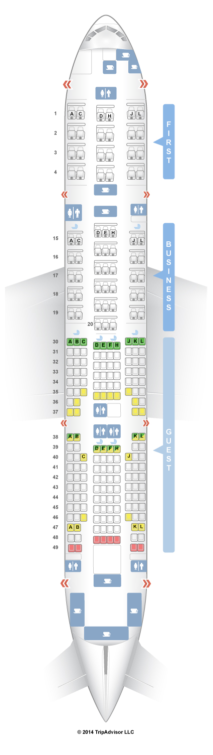 Saudia Airlines flies two versions of the Boeing 777-200. This version has 232 seats in a three-class configuration of First, Business, and Economy. Guest Class is Saudia's Economy Class product.